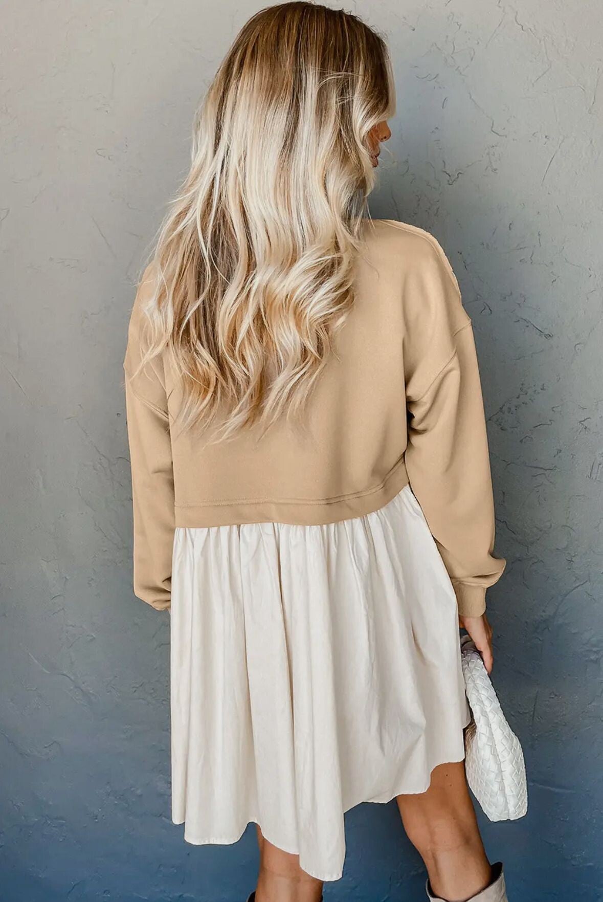 Deze sweatshirt poplin mini jurk combineert het comfort van een sweatshirt met de luchtige elegantie van een contrasterende poplin rok. De mix van materialen zorgt voor een speelse maar stijlvolle uitstraling, ideaal voor wie graag comfortabel gekleed is zonder in te boeten op stijl.