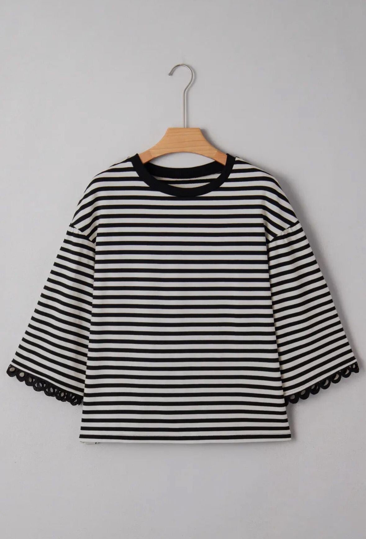De wijde mouwen met een verfijnd ajourdetail geven deze top net dat tikkeltje extra en maken van deze basic een echte eyecatcher. Makkelijk te combineren, flatterend en perfect voor elke dag.