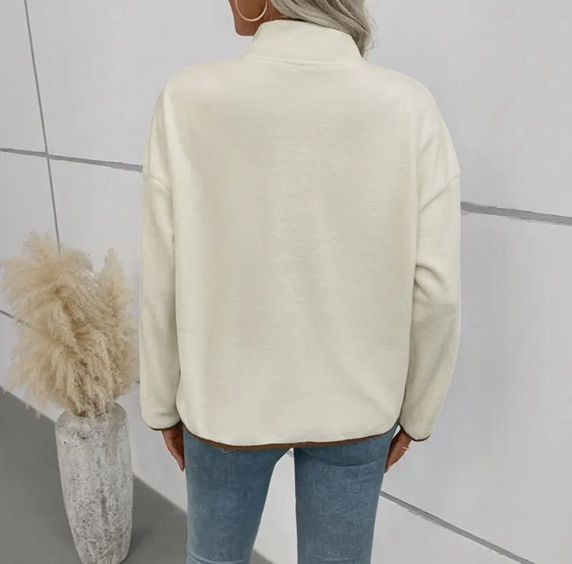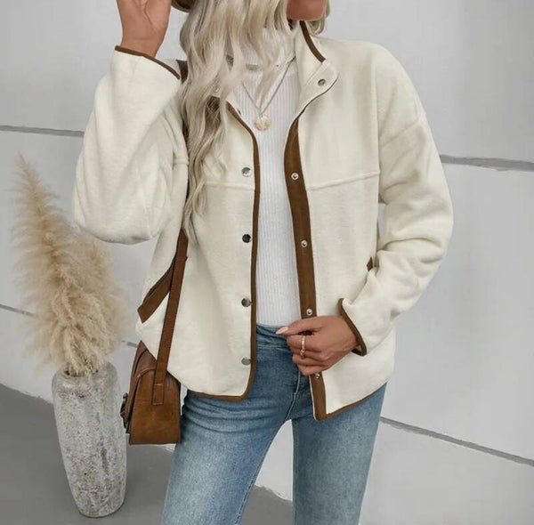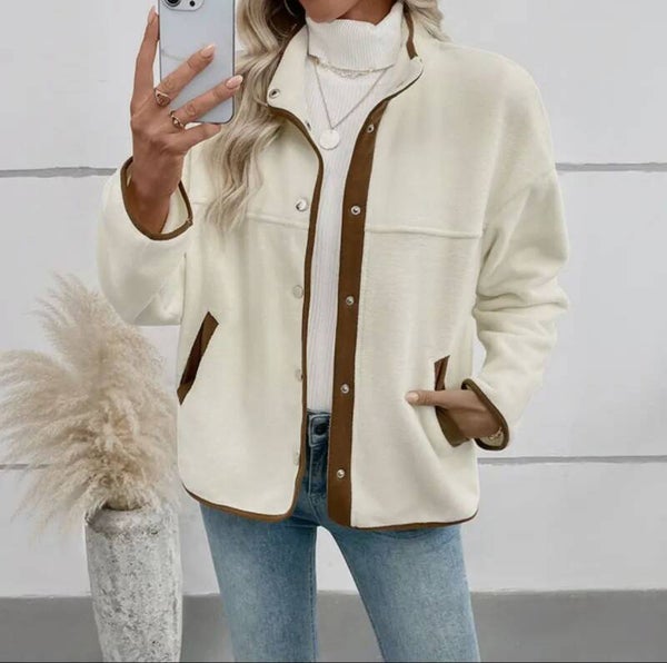Dit fleece jacket is een echte comfort essential voor frisse dagen. De zachte fleece stof voelt heerlijk cosy aan en wordt stijlvol afgewerkt met een donkerbruine contrasterende bies aan de rits en zakken. Die details geven het jacket een verfijnde en moderne uitstraling.