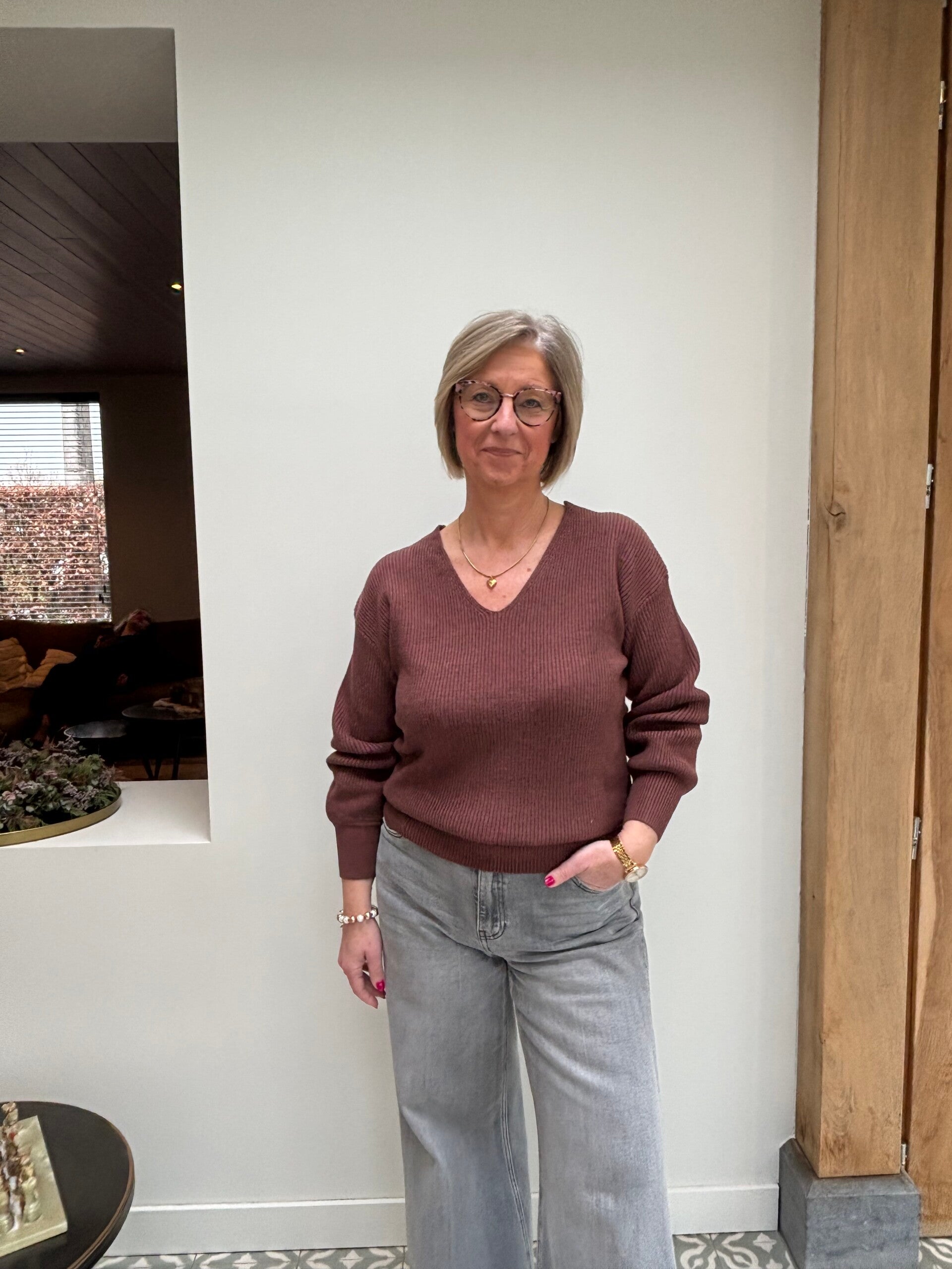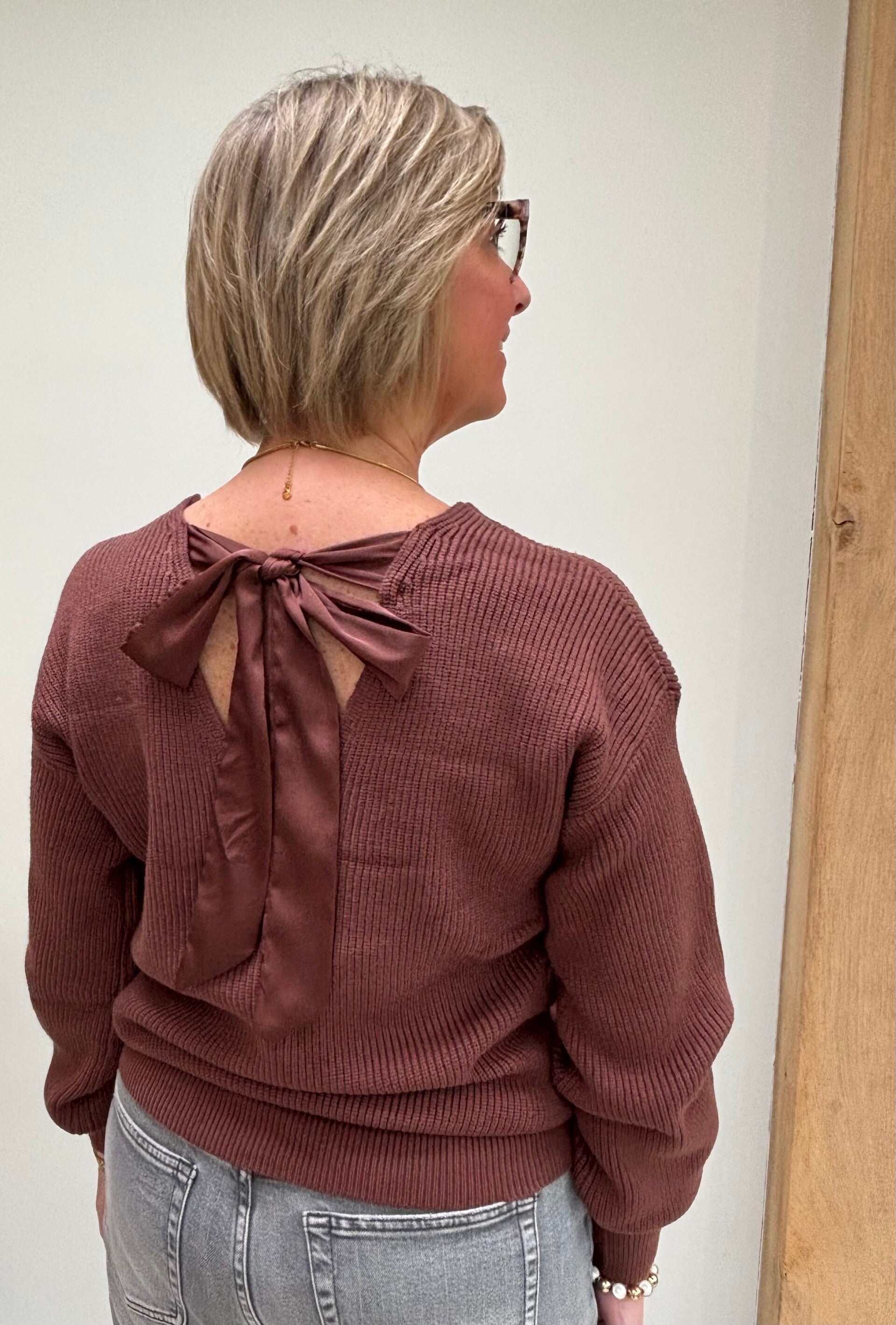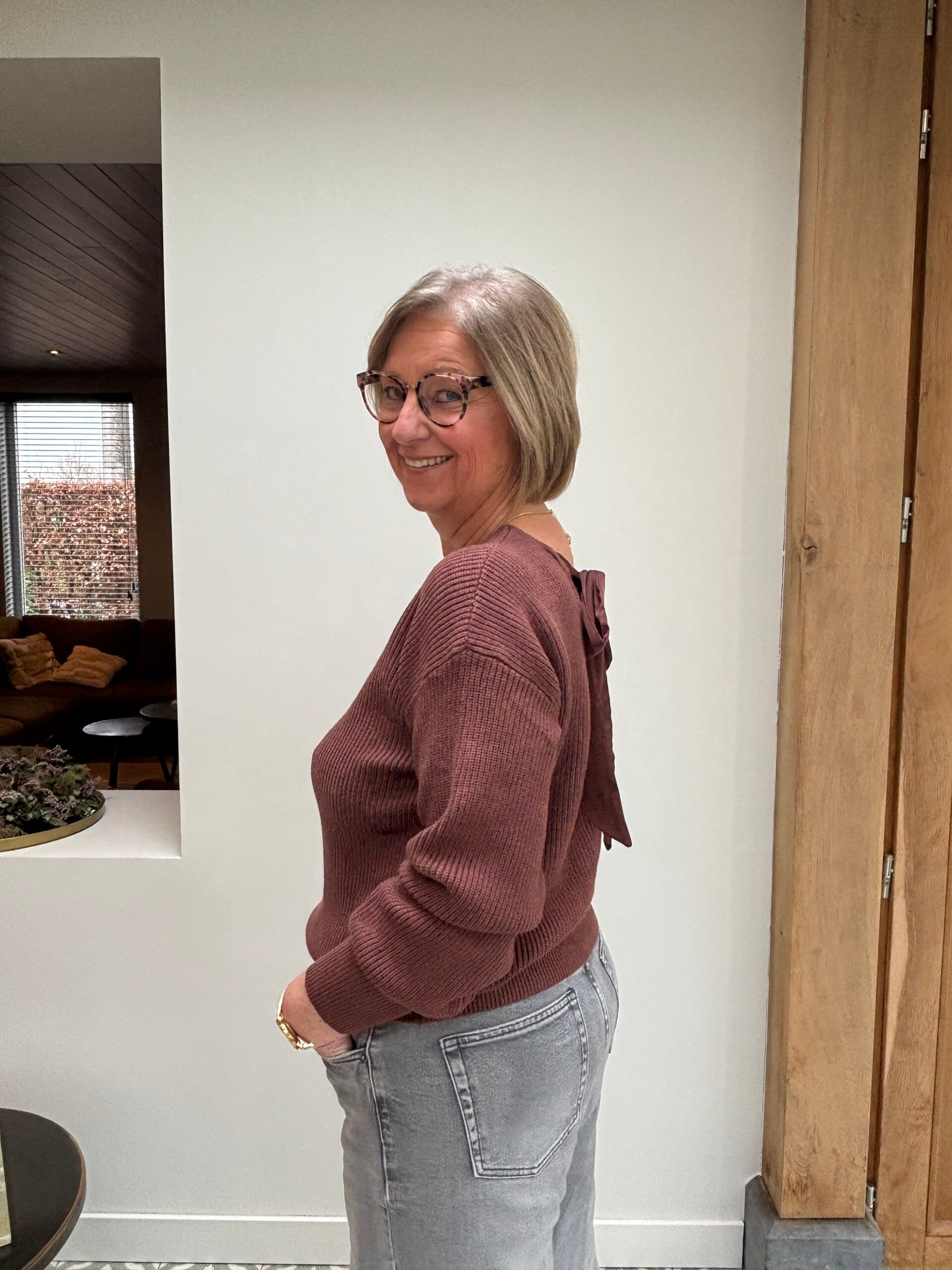 De echte eyecatcher zit aan de achterkant: een open rug met een stijlvolle strik in een zachte, contrasterende stof. Dit detail geeft de trui een subtiele fancy touch en maakt haar net dat tikkeltje anders dan een klassieke knit.